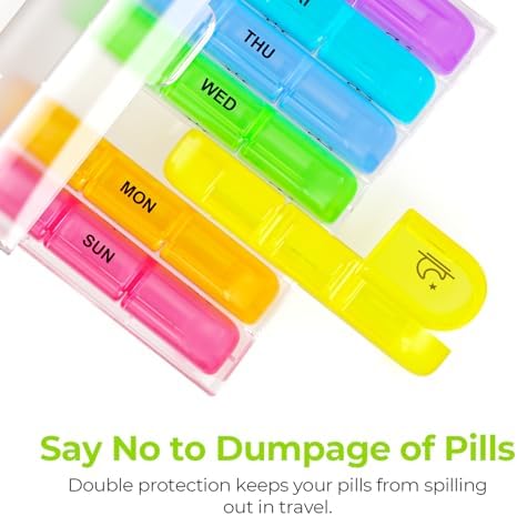 Say No to Dumpage. No worries about dumpage by your incidental touch or children’s sneaky hands. Pill box 7 day with double protection, the lids of the vitamin container stay closed all the time and pills will never pop out in your bag or your purse.