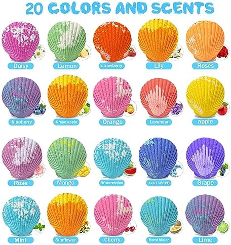 20 DIFFERENT SCENTS- You can choose your favorite scent and enjoy the bath time. 20 scent: Rose, Blueberries, Strawberry, Chamomile, Green apple, Lemon, Ocean, Jasmine, Orange, Vanilla, Coconut, Milk, our bath bombs are protective and pacifying with amazing skin softening and moisturizing.