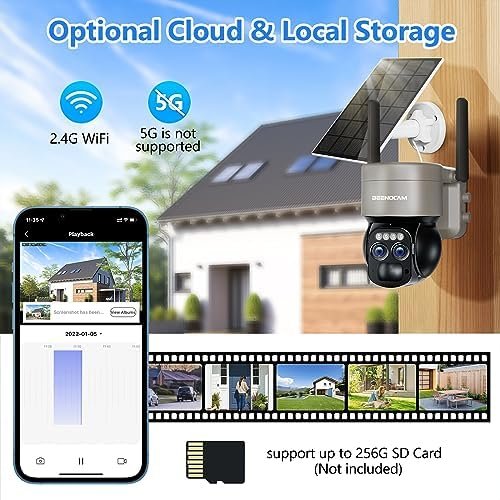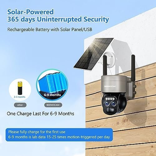 • Solar Powered & 100% Wire-Free & 5dbi Dual Antennas: BEENOCAM cameras for home security outside built with solar panel and 15000mAh rechargeable battery, providing 365 days non-stop power supply. 100% wireless, no circuit wiring hassles or external Installation fee, set up solar camera freely anywhere, like a shop, home, garage, yard,hotel, outdoor. Upgraded 5dBi dual antenna ensure more stable and stronger wifi. Real-time videos are smoother, clearer. Only supports 2.4Ghz WiFi not 5GHz.