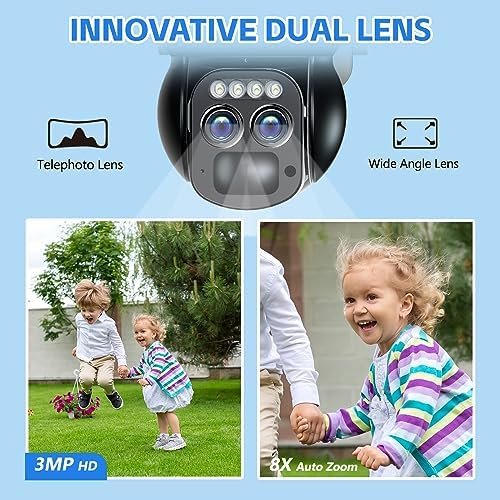 • 8X Zoom Security Camera & 360°Coverage: 8X Digital zoom-in for you see clearer details with enlarged image. The PTZ outdoor security cameras wireless outdoor wifi supports horizontal 355°and vertical 90°pan-tilt rotation auto tracking, providing you with 360°all-round protection almost no blind spots. You can also manually rotate the wifi camera to see different directions and monitor any corner remotely via the APP, protecting your property and family!