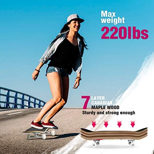 Sturdy and Strong: The board is 10mm thick and composed of 7-Ply Canadian Maple Wood, strong and durable to withstand riders up to 220 pounds. It’s equipped with 5″ Heavy-Duty Aluminum Alloy Trucks, making them reliable and sturdy, safe for beginners and expert riders. Suitable for all-level riders with different riding styles, cruising, commuting, tricks and freestyling.
