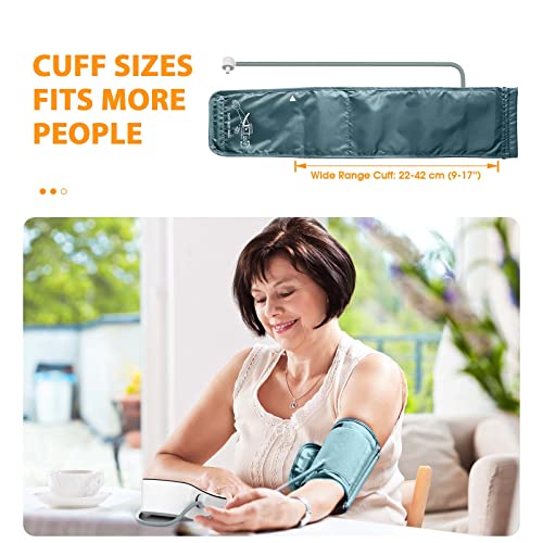 [Adjustable Blood Pressure Cuff] The cuff should comfortably fit most adult arms with a circumference of 9in to 17in. The cuff should fit securely at the proper spot for more accurate readings
