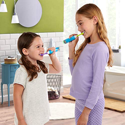 REPLACEABLE TOOTHBRUSH HEAD–Includes 2 soft brush heads (1 purple and 1 green) that are gentle on teeth and gums. Batteries included. For ages 5 and older.