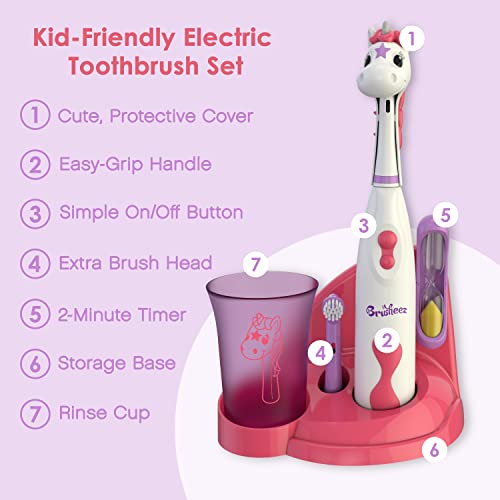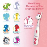 WHAT YOU GET: Battery-powered children’s toothbrush, animal-themed brush cover, replacement brush head, rinse cup, 2-minute sand timer, stand, user manual, printed brushing chart, and industry-leading 5 Year Warranty.