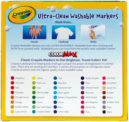With Crayola Broad Line Markers, your child can dive into a world of colorful possibilities! This set features 40 Crayola Ultra Clean Washable Markers in assorted colors, offering practicality, versatility, and endless creativity all in one package. These washable markers are a game-changer for parents. Say goodbye to the worry of stains on clothes, carpets, or furniture with less mess markers that wash easily, giving you peace of mind and making cleanup a breeze. Ignite your child’s imagination with 40 unique colors to choose from, featuring fine tips that are perfect for coloring and drawing so your child can explore their artistic talents and create stunning masterpieces. Back to school means it’s time to equip your child with the essentials. These washable markers are a must-have for every school supply list. They’re not just for coloring – they’re perfect for note-taking, highlighting, and all sorts of school projects. From art projects to classroom activities, let Crayola be your go-to brand for art and school supplies. These markers are perfect for art projects, classroom activities, and any activities that require fine details. Let your child’s imagination soar with the power of Crayola Broad Line Markers!