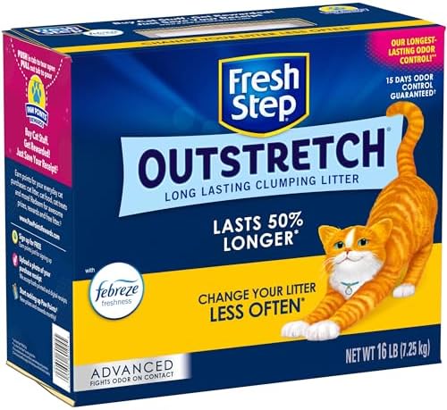 Change your litter less often* with Fresh Step Outstretch Advanced Long Lasting Clumping Litter. Innovative microgranule technology absorbs 50% more liquid waste and odor so litter lasts 50% longer*, extending time between changes. This cat litter traps liquid waste at the surface to form tight clumps with less crumbles that make scooping and cleaning a breeze. 16lb of Fresh Step Outstretch lasts as long as 24lb of Fresh Step Multi Cat Litter so you can use less litter. Fresh Step Outstretch Advanced with Febreze freshness and 6x activated charcoal for superior odor control* and has a 15 days odor control guaranteed. Fresh Step Outstretch Advanced long lasting clumping litter makes it easier to keep the box clean and smelling fresh. Certain trademarks used under license from The Procter and Gamble Company or its affiliates.*vs. Fresh Step Multi-Cat