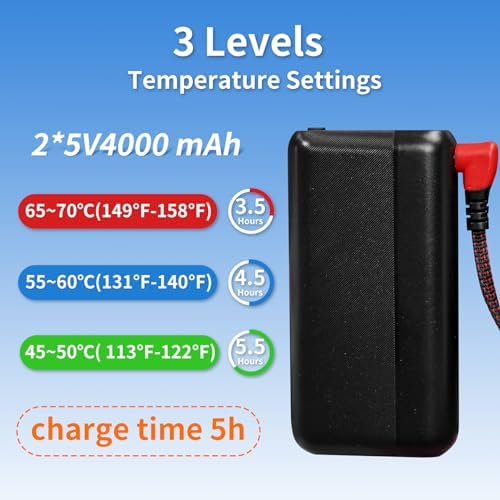 Three Levels of Electric Rechargeable Heated Socks – For electric heated socks level, high with red light144-153°F(±5), medium with blue light 126-135°F(±5), low with green light 108-117°F (±5). Powered by two 5V/4000mAh batteries, it is thermally stable. The heated socks just need to heat up in about 30 seconds, and the heating efficiency is high. After charging for 5 hours, the longest heating time can reach about 5.5 hours.