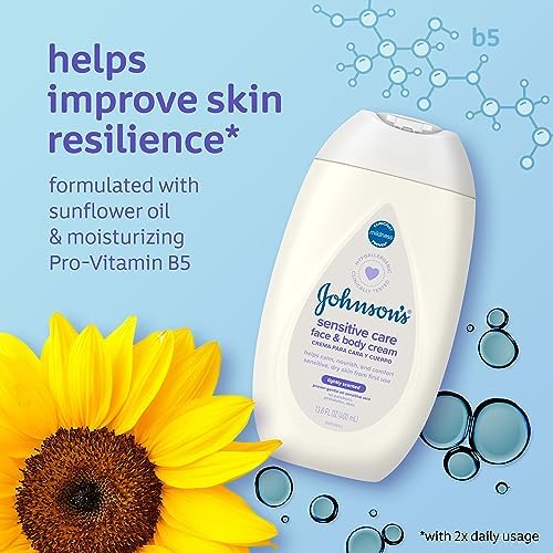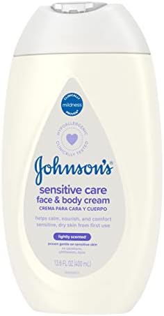 Calm, nourish, and comfort your baby’s dry, sensitive skin with Johnson’s Sensitive Care Face and Body Cream for Babies. This gentle, hypoallergenic daily baby body and face cream has a soothing, ultra-hydrating formula that provides immediate and long-lasting moisture with a non-greasy feel. Clinically proven mild and clinically tested on dry, sensitive skin, the soothing, lightly scented moisturizer is formulated with sunflower oil and moisturizing Pro-Vitamin B5 to help relieve and prevent dryness. The daily hydrating cream also helps improve your baby’s skin resilience* and has been tested and proven to work on different baby skin tones. Pediatrician & dermatologist tested, the lightly scented baby cream is formulated to be free of parabens, phthalates and dyes and is perfect for adding to baby’s daily skin care routine–simply massage gently into baby’s skin. *with twice daily usage