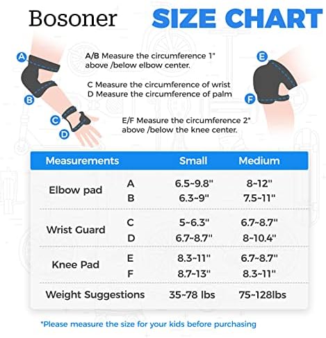 The BOSONER Kids’ Multi-Sport Pad Set with Wrist guards, Elbow Pads, and Knee Pads offers maximum protection, comfort, and mobility for biking, skateboarding, rollerblading, roller skating, and scooters. Each pad set includes two wrist guards, two elbow pads, and two knee pads for total multi-sport coverage.
