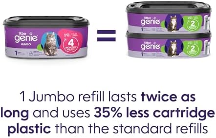 LONGER USE, LESS WASTE: With 56 feet of bags, Litter Genie’s new and improved jumbo refills last longer than any other while using 35% less plastic! Lasting twice as long as our standard refills, you can use these packs for up to 8 whole months, for one cat.