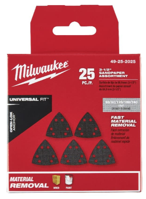 The Universal Fit OPEN-LOK™ Triangle Sandpaper is designed for Oscillating Multi-Tools. The triangle sandpaper utilises hook and loop technology for you to make fast and secure paper changes. The universal dust extraction hole placement allows for use with most dust extraction systems. The long-lasting silicon carbide grit is ideal for wood and paint. This MILWAUKEE® sandpaper works with any Triangle Sanding Pad with hook & loop technology.