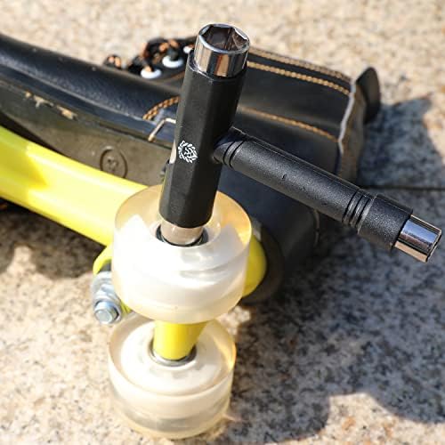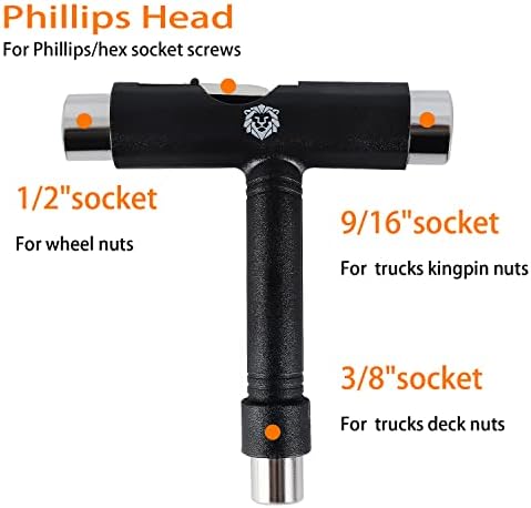 【Innovative Structure】:The T skateboard tool includes 3 different of size sockets: 1.9/16″socket For kingpin nuts fixed disassemble 2.3/8″socket For trucks deck nuts fixed disassemble 3.1/2″socket For wheel nuts fixed disassemble 4.L-wrench For Phillips/hex socket screws fixed disassemble