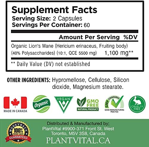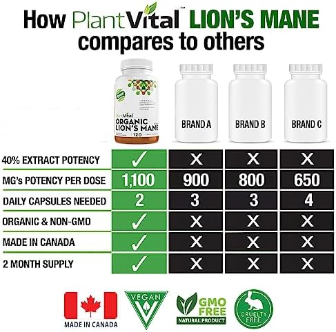 GENEROUS DOSAGE: Plantvital’s mushroom supplements of 1,100 mg per serving of 100% Lions Mane Extract is the highest available with 40% Polysaccharides.