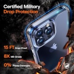 • 15FT Military-grade Protection TAURI for iPhone 15 Pro Case Clear is certified drop test, combines a soft-frame and hard PC back cover with 4 built-in corner Airbags to absorb impact, can prevent your phone from accidental drops, bumps and scratches.