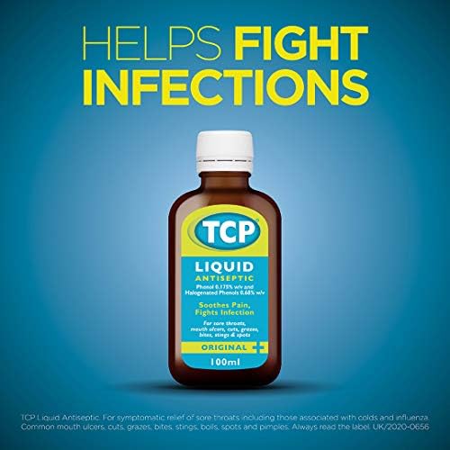 TCP Liquid Antiseptic dual action which soothes pain, fights infection for sore throats, mouth ulcers, cuts, grazes, bites, stings and spots. Warnings: seek medical advice if symptoms persist for more than a few days. Keep out of reach of children. Do not use after the ‘expiry date’.