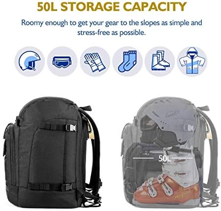 50L STORAGE CAPACITY: Unigear ski boot bag features a thoughtful design, which can go a long way toward making the prospect of getting your gear to the slopes as simple and stress-free as possible. Possessing 50 liters of storage capacity, it’s big enough to store boots, helmets, goggles, clothing, valuables, and more. If you have a lot of equipment to store and transport, this bag will surely get the job done.
