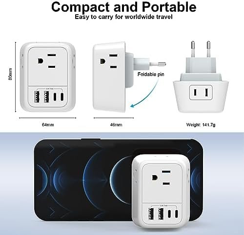 • Compatible for Multi-devices: USB C charger plug contains 1 universal socket + 3 USB-A ((5V / 2.4A) +1 USB C (5V / 3A) ports. Travel adapter with USB is not only suitable for most high-power electronic devices but also for most USB devices like cameras, smartphones, tablets, Portable Game Console, Bluetooth speakers, Power bank, etc. Especially USB-C port is convenient for charging your phone.