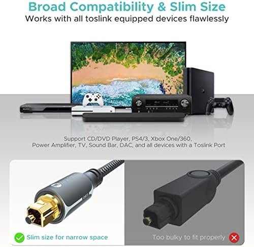 • [Top-Notch Fiber Core] This 6 ft Digital Optical Audio Cable adopts fiber cores from TORAY, Japan for zero distortion digital audio stream. Ideal for uncompressed PCM audio, compressed 5.1 to 7.1 surround sound systems including Dolby Digital Plus, DTS-HD High Resolution and LPCM. Turn your living room to home theater.