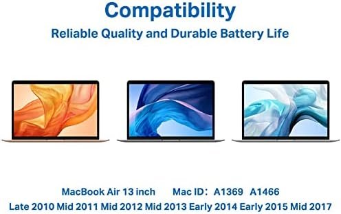 • Replacement Battery for MacBook Air: Made for MacBook Air 13 inch A1466 (Mid 2012, Mid 2013, Early 2014, Early 2015, 2017 Version), A1369 (Late 2010, Mid 2011 Version), MC503LL/A, MC504LL/A, MC965LL/A, MC966LL/A, MD231LL/A, MD232LL/A, MD760LL/A, MD761LL/A, MD760LL/B, MD761LL/B, MJVE2LL/A, MJVG2LL/A. EMC Applicable number: 2469/2559(see compatible models)
