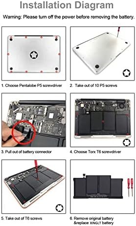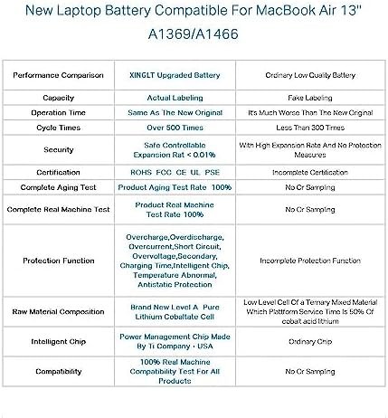 • Newest Premium Grade Cells: XINGLT MacBook Air laptop replacement battery ensure fast charges and low power consumption; Built-in circuit protection ensures both safety and stability. UL-/CE-/FCC-/RoHS-Certified for safety, About 500 recharge cycles over the life of the battery,(Life cycle: 3-5 years)